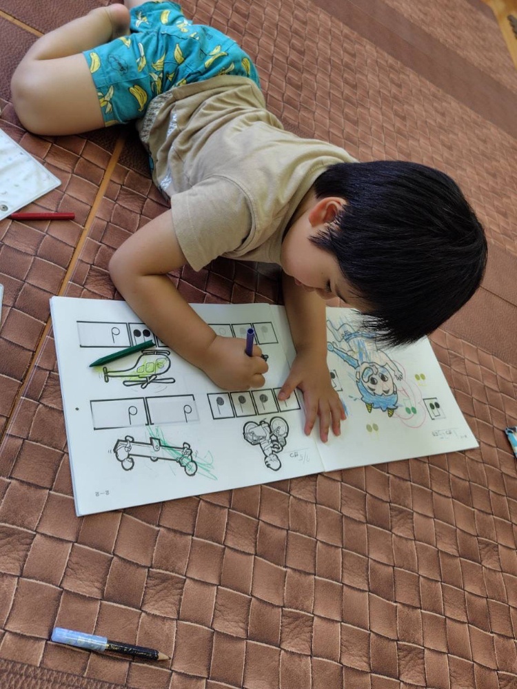 小さな手で色鉛筆(クーピー)を握り、好きな色をぬりながら音符やリズムの基礎を学んでいます。